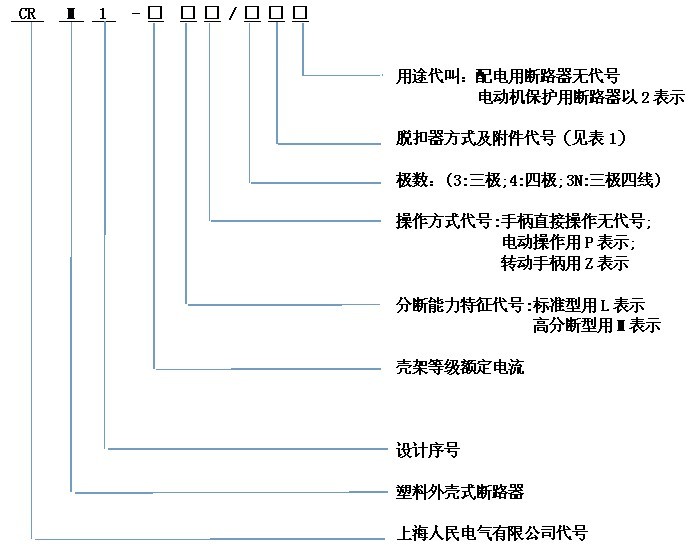 1200:表示仅有电磁脱扣器的断路器;300:表示带有热动—电磁脱扣器的断路器;000:表示不带过流脱扣器的断路器(隔离开关);