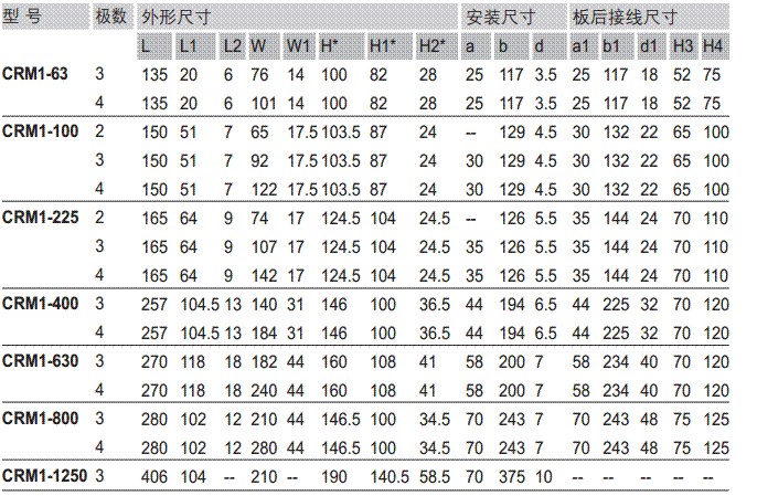 2、对CRM1-100225二极产品只有210310220320230330;对CRM1-63100225四极断路器,N极为A型和D型时无240340360260268368
